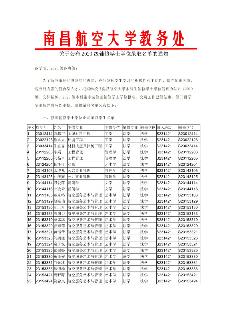 关于公布2023级辅修学士学位录取名单的通知 来源: 发布时间:2024-10-29 18:24:45 浏览次数: 次 【字体:小 大】 关于公布2023级辅修学士学位录取名单的通知.pdf关于公布2023级辅修学士学位录取名单的通知.doc 责任编辑:70577 【打印正文】